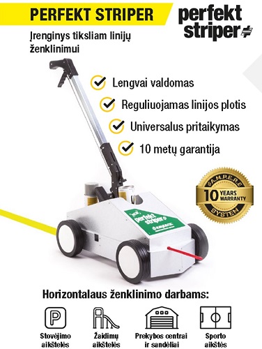 Žymios Prancūzijos kompanijos, a.m.p.e.r.e® System horizontalių linijų ženklinimo (žymėjimo) vežimėlis PERFEKT STRIPER patikimas įrankis linijų ženklinimui automobilių stovėjimo ir žaidimų aikštelėse, stadionuose, pramonės ir logistikos objektuose. Jis yra tvirto ergonomiško dizaino, lengvai valdomas, minkštai rieda ir gaunamos tikslios ženklinimo linijos.